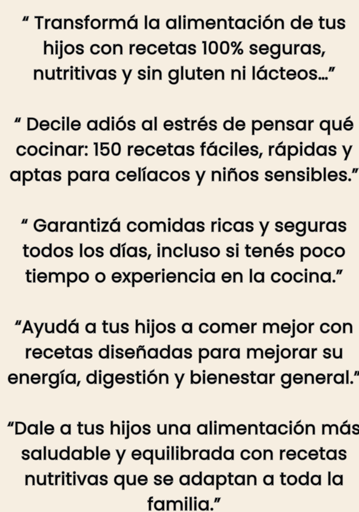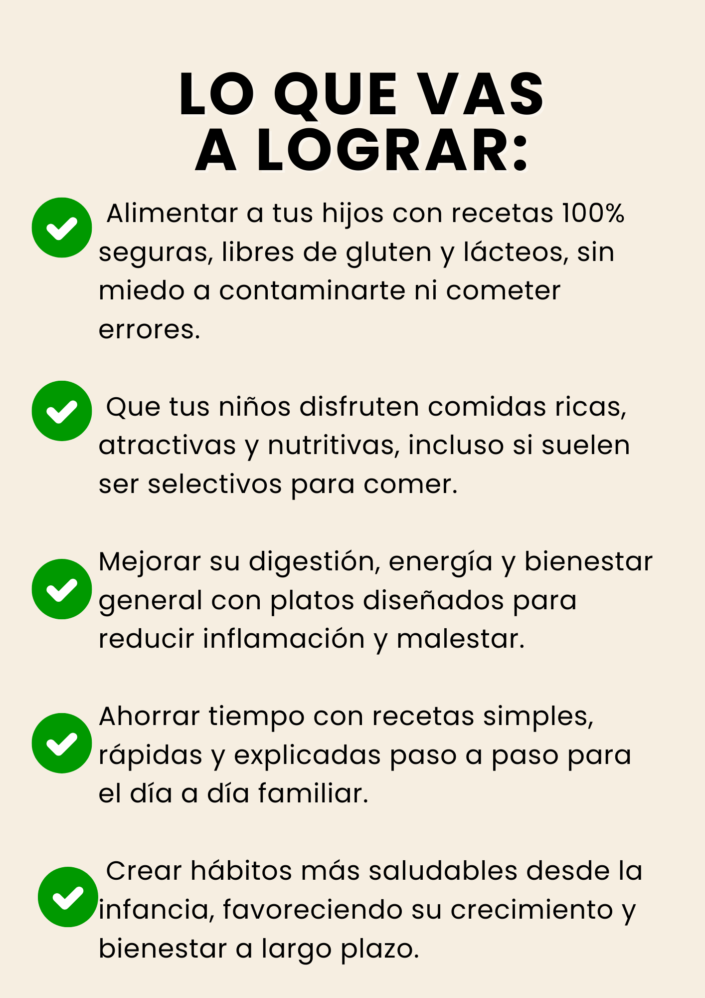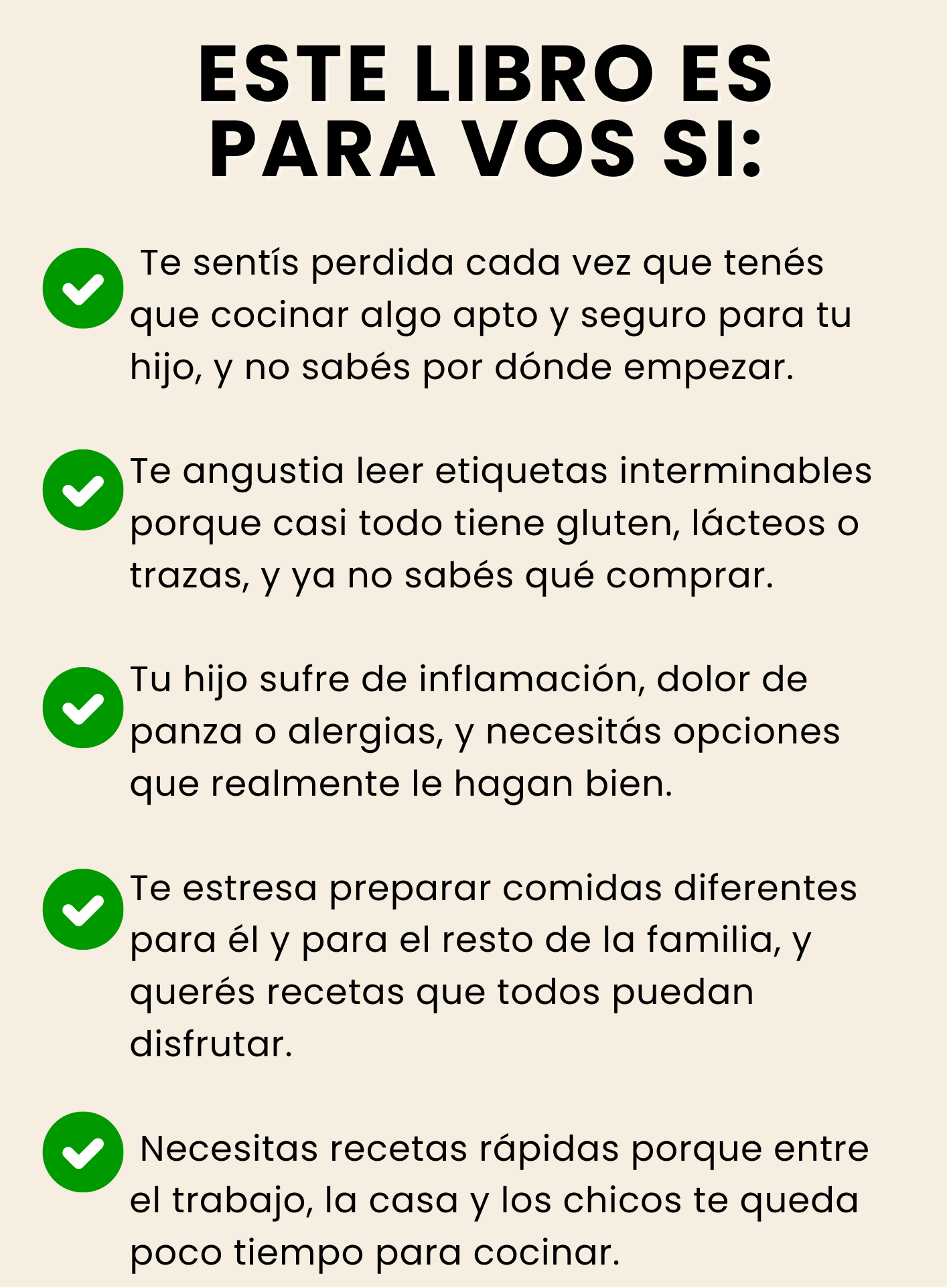 Si este recetario no te ayuda a preparar comidas seguras, ricas y sin gluten ni lácteos para tus hijos, podés solicitar el reembolso completo dentro de los primeros 7 días.